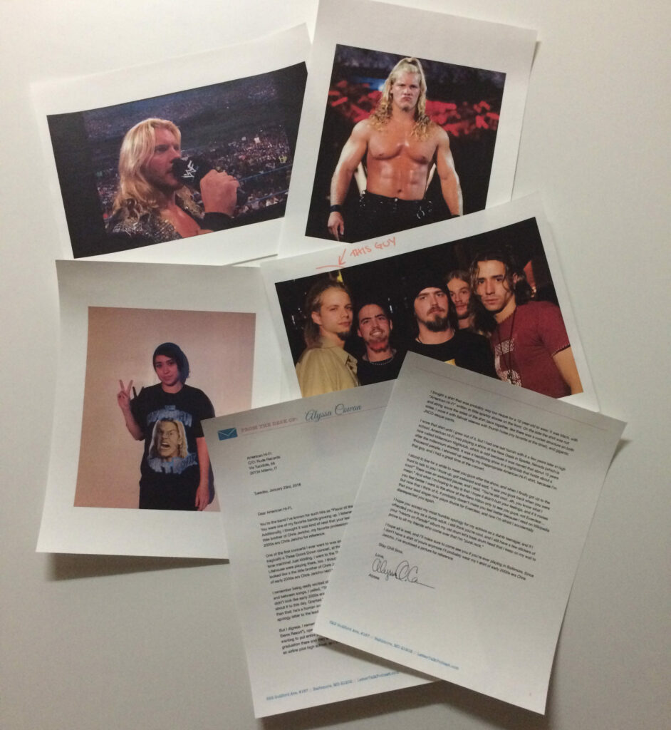 I hope all is well, and I’ll make sure to come see you if you’re ever playing in DC or Baltimore. Since I don’t have a shirt of yours anymore I’ll probably wear my t-shirt of early 2000s era Chris Jericho. I’ve enclosed a picture for reference.