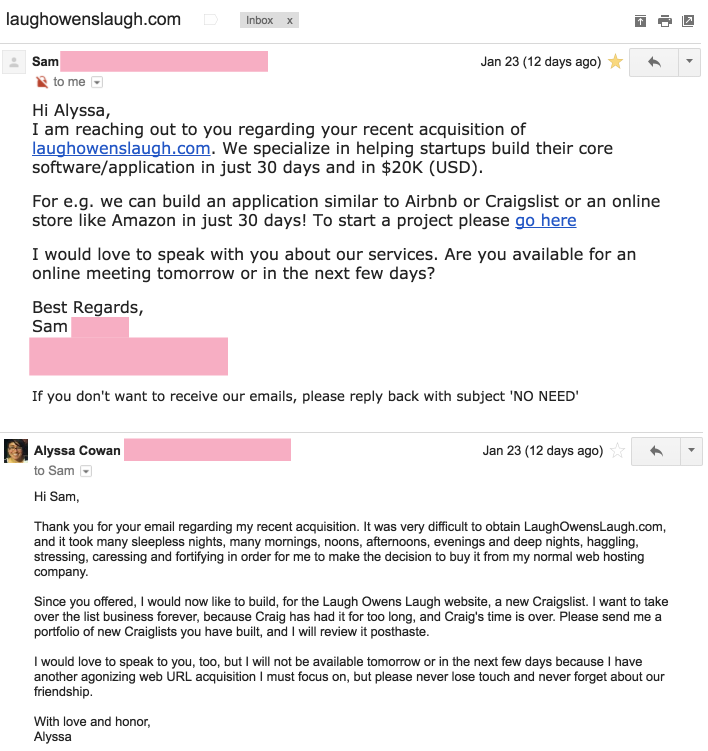 Thank you for sending your quarterly newsletter to my work office. I hope you will not mind that I read the newsletter even though it was addressed to Ellen. I regret to inform you that Ellen is dead… Actually I don’t know that at all, but there’s definitely nobody in my office with that name. Or maybe there is, and you guys almost blew somebody’s witness protection cover. I’d ask around, but I’m the type of person to stir my coffee with a pen in order to avoid going to kitchen because people might be there who want to talk to me.
