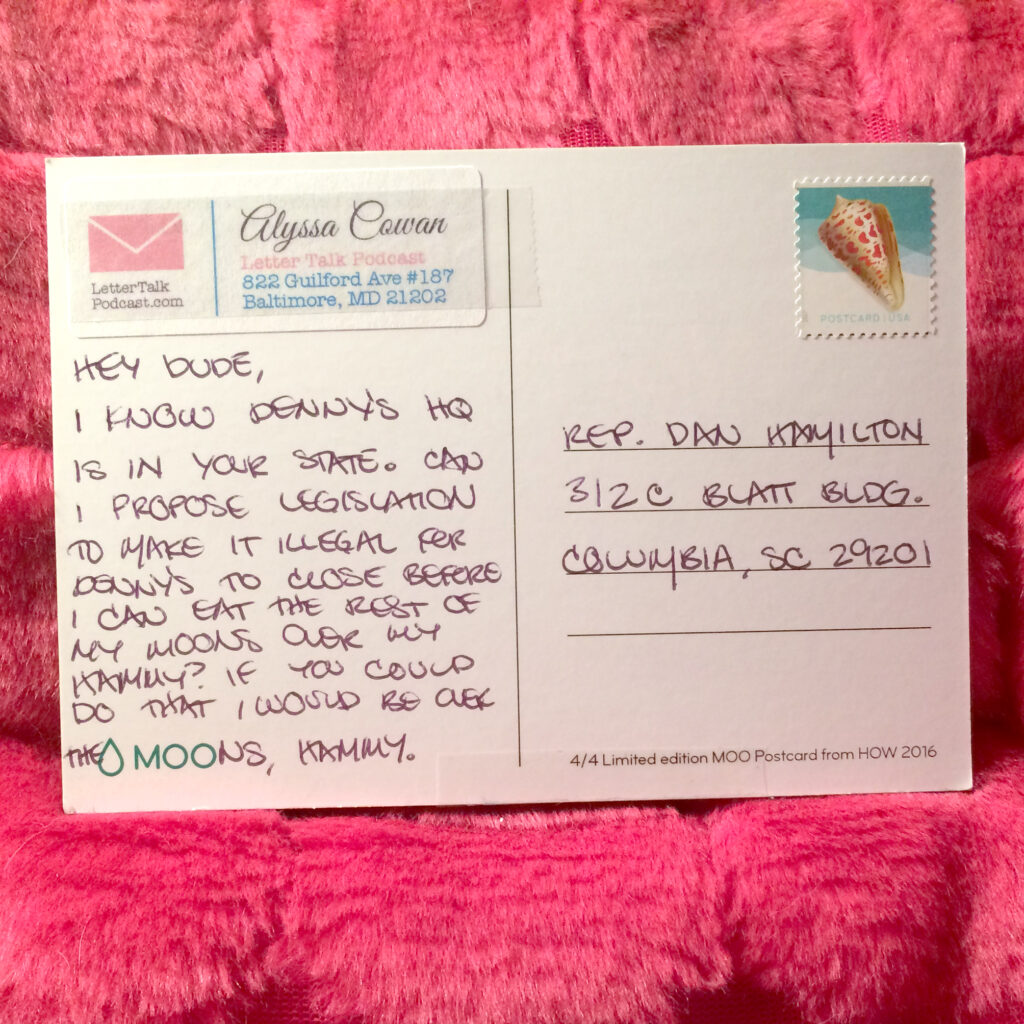 Hey dude, I know Denny’s HQ is in your state. Can I propose legislation to make it illegal for Denny’s to close before I can eat the rest of the moons over my hammy? If you could do that I would be over the moons, Hammy.